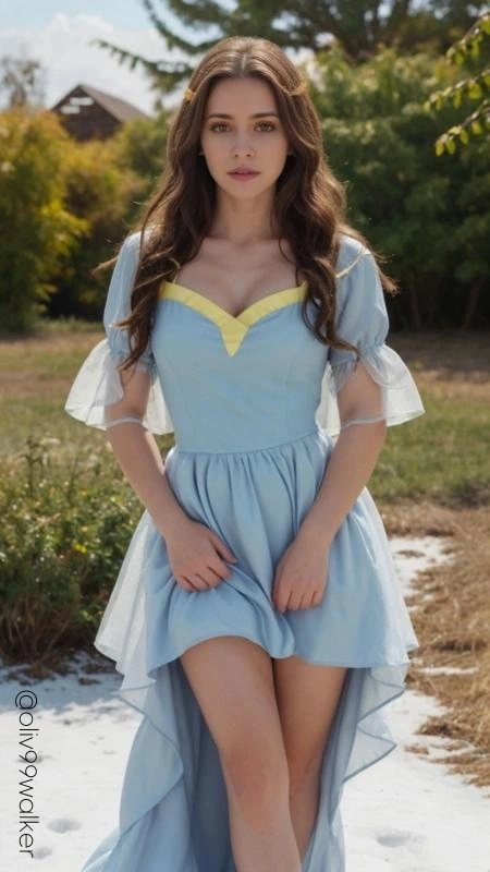 Un vestido inspirado en el clásico cuento de hadas, con un moderno giro. El suave color azul cielo del traje se complementa con detalles en amarillo pastel, creando una apariencia etérea y romántica, ideal para quienes deseen encarnar a la princesa en su noche mágica.