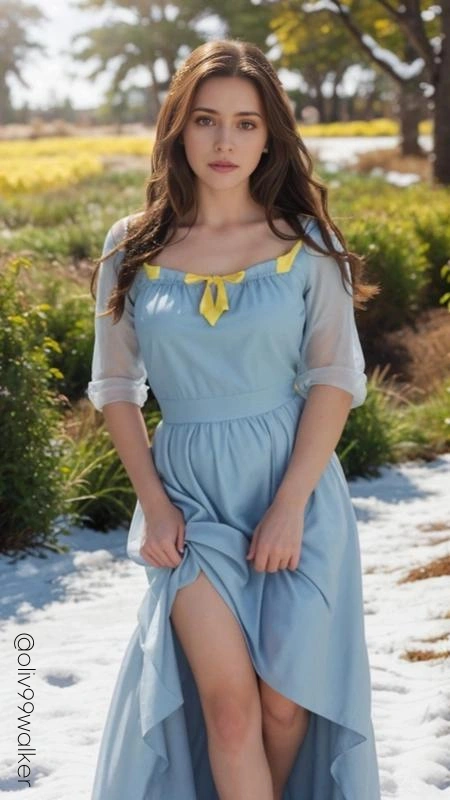 Un vestido inspirado en Blanca Nieves, una de las princesas clásicas de cuentos de hadas. La parte superior del vestido es de un azul intenso con detalles dorados alrededor del escote. Los hombros y mangas están hechos de un material translúcido, dando un toque mágico y etéreo al conjunto.