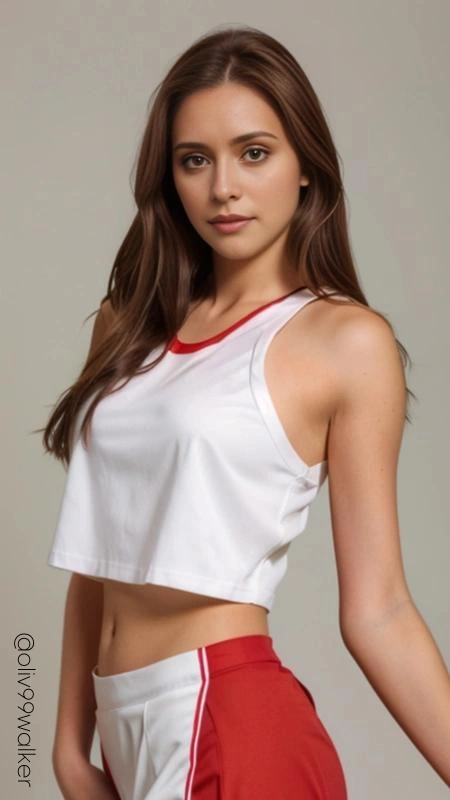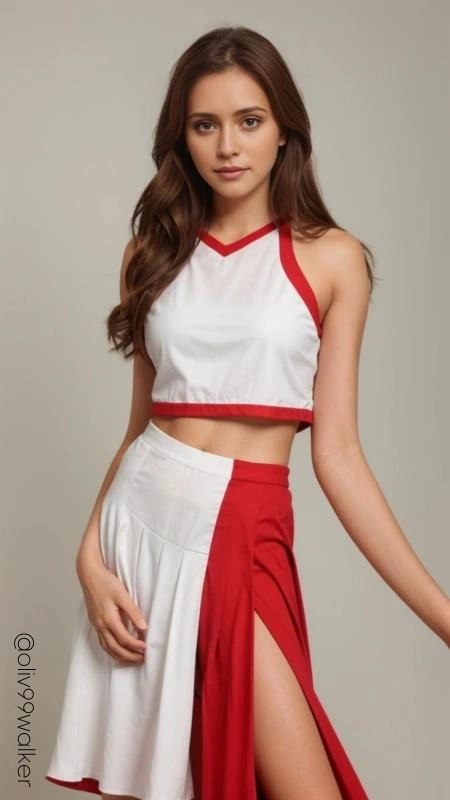 Un traje fresco y animado que captura el espíritu enérgico de una porrista. Con una combinación de blanco y rojo, el atuendo presenta un top corto y una falda plisada, ideal para realizar movimientos de baile y porras.